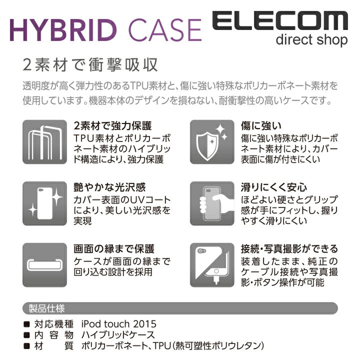 ■対応機種:iPod touch 2015■セット内容:ケース本体×1■カラー:クリア■材質:本体:ポリカーボネート、TPU(熱可塑性ポリウレタン)エレコムダイレクトショップ透明度が高く弾力性のあるTPUと傷に強い特殊なポリカーボネートの2つの素材を使用したiPod touch2015用ハイブリッドケースです。
